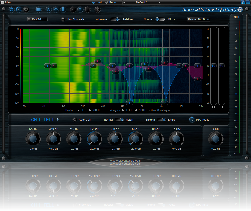 Der Liny EQ von Blue Cat ist ein linearer 8-Band-Phasen-Equalizer mit sehr geringer Latenz und umfassendem visuellen Feedback: Dank seines hochoptimierten linearen Phasenkerns verarbeitet er das Signal ohne Phasenverzerrung mit einer ungewöhnlich kurzen Latenz (weniger als 3 Millisekunden). Dank seines breiten Bereichs an Gain-Werten (+ -40 dB) und mehrerer Filterformen ist er für einen grafischen EQ sehr flexibel, sodass Sie einzigartige EQ-Kurven erstellen können. Die Zweikanalversion bietet unabhängige Einstellungen für den linken / rechten oder den mittleren / seitlichen Kanal sowie flexible Verknüpfungsmöglichkeiten für einen optimalen Arbeitsablauf. Die hochgradig anpassbare Benutzeroberfläche umfasst einen erstklassigen Spektrumanalysator und Spektrogramm-Viewer. Hier können Sie das beste Layout und die besten Anzeigeoptionen auswählen, um das Plug-In an Ihren eigenen Workflow anzupassen.