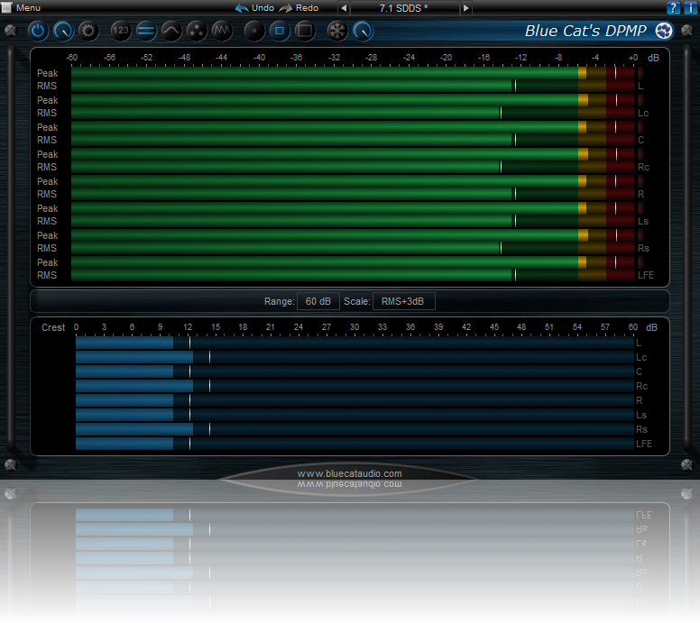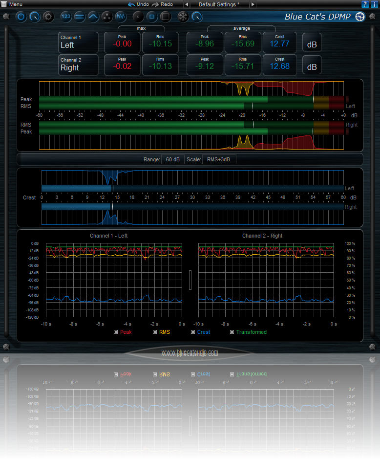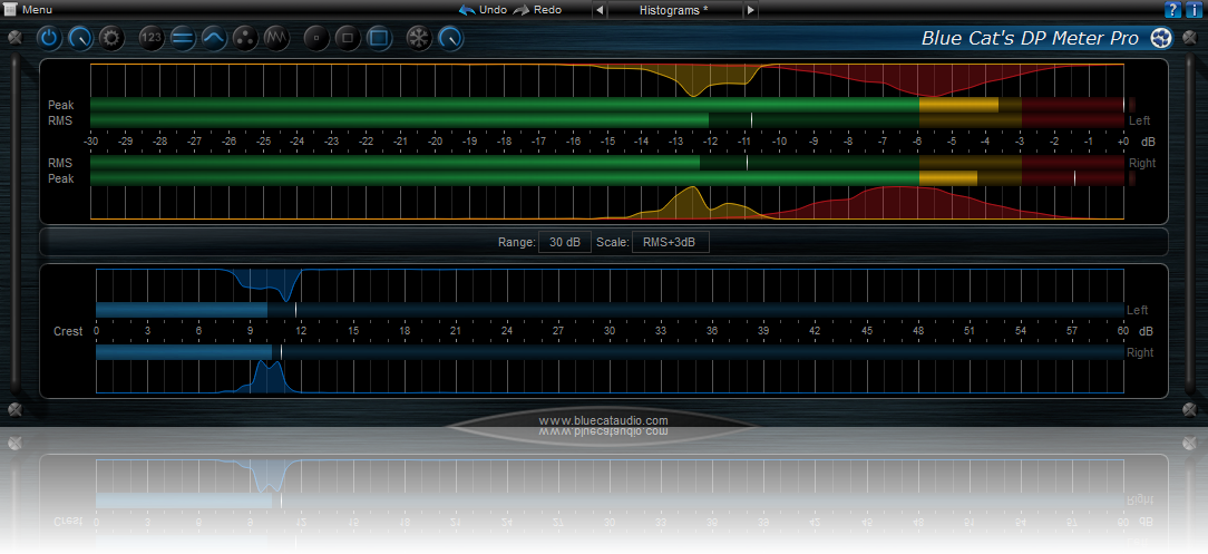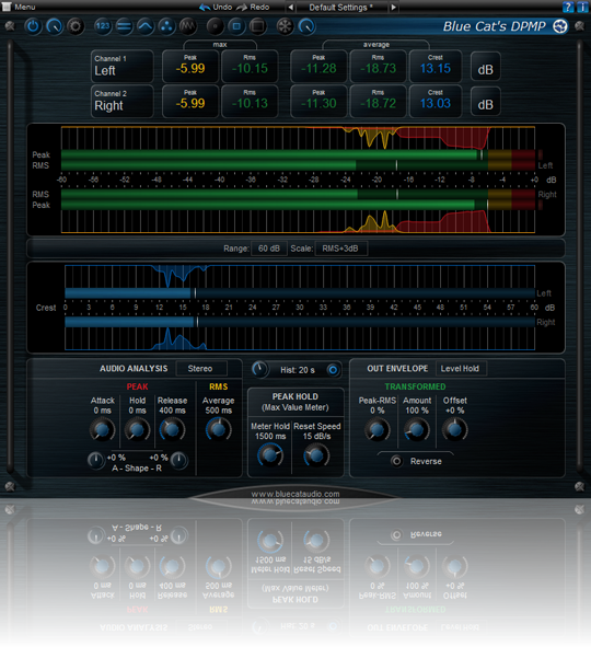 Die Einstellmöglichkeiten des neuen DPMP lassen Sie Ihre Audio-Signale genau so steuern und überwachen (Peak, RMS, Crest Faktor), wie Sie es möchten. Fast jeder Anzeigeparameter kann individuell angepasst werden. Der DPMP beinhaltet nun fünf verschiedene Skalen, einschließlich des sehr beliebten Bob Katz K-System (K-12, K-14 und K-20). Sie können Ihre eigenen Skalen gestalten. Mit den graphischen Anzeigen überwachen Sie die Entwicklung der Audio-Signale über einen bestimmten Zeitraum. Über die Mitte-Seite-Schalter können Sie die Mono-Kompatibilität und die Stereobreite Ihrer Audio-Signale sehr leicht überprüfen.