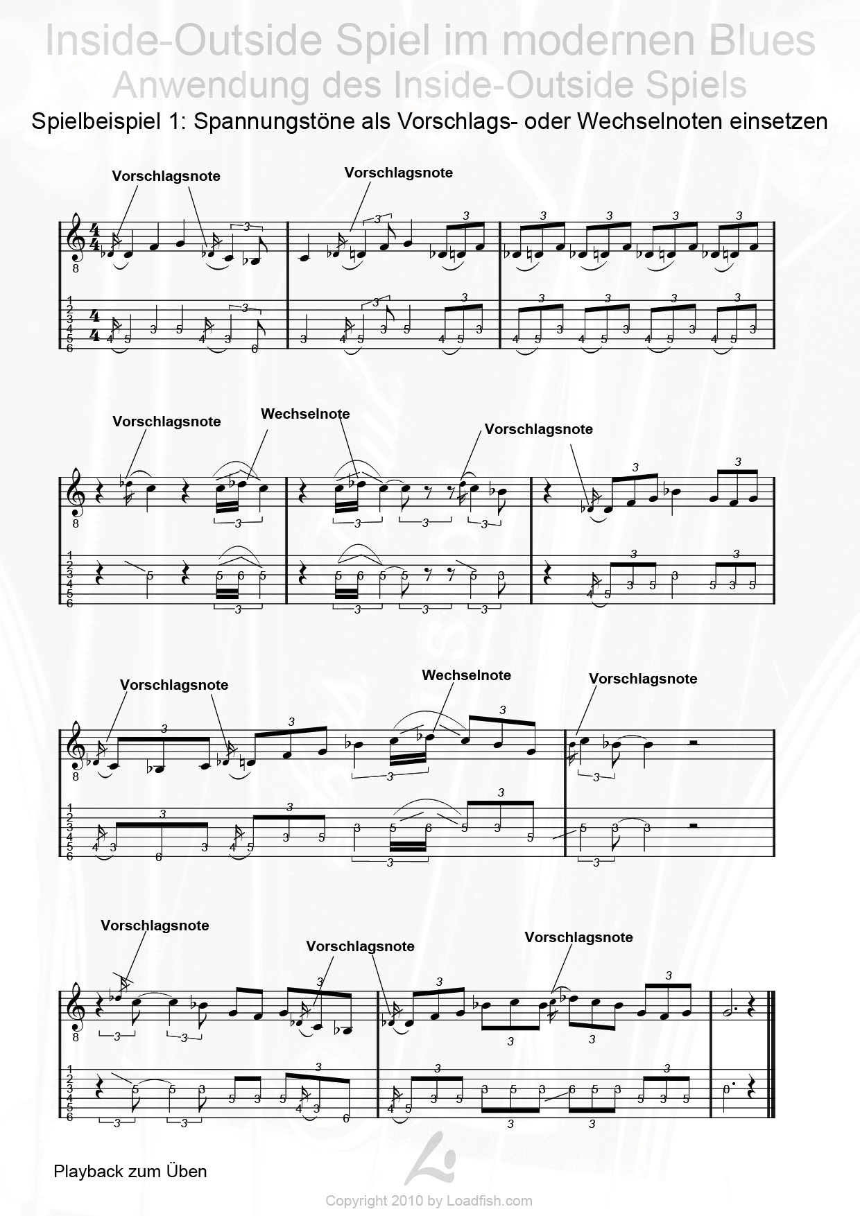 An Hand zahlreicher Spielbeispiele (Video), Play-Alongs (Audio) in CD-Qualität sowie Skalen- und Akkord-Abbildungen wird auf leicht verständliche Art und Weise das Inside-Outside Spiel im modernen Blues erläutert. Da in diesem Workshop neben anspruchsvollen Solo-Lines auch grundlegende Basics über Improvisation, Skalen und Akkordaufbau vermittelt werden, ist er sowohl für Anfänger als auch fortgeschrittene Spieler hervorragend geeignet. Sämtliche Video- bzw. Audiobeispiele stehen als Noten und in Tabulaturschreibweise zur Verfügung.